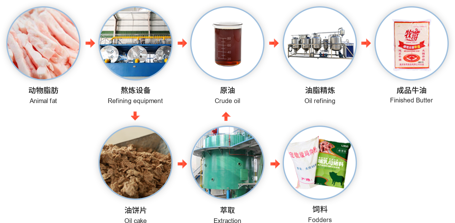 動物油設(shè)備正規(guī)大型流水線工藝大致分為:絞肉、輸送、分料、蒸煮、油渣分離、過濾、熬煉毛油、精煉。